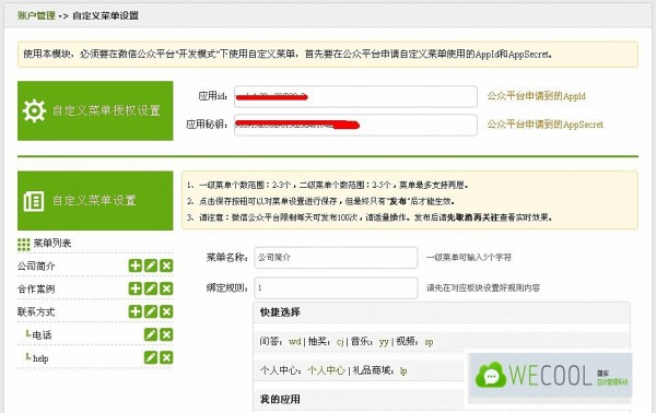近日,微庫又配合微信5.0上線了一批新功能,其中就包括自定義菜單編輯模塊。在注冊微庫平臺后,企業(yè)只需要提供申請服務(wù)號所得的應(yīng)用ID和密鑰,即可在微庫的自定義菜單模塊,為服務(wù)號實現(xiàn)輕松設(shè)置自定義菜單,提高與客戶的運(yùn)營交互效果,讓顧客養(yǎng)成習(xí)慣,在固定時間來看新品、看優(yōu)惠。