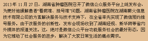 現在可能金融行業(yè)、航空業(yè)等出了一些像南航、招行等不錯的微信應用,但是有非常多的的行業(yè)還是空白的,非常大的機會。像醫(yī)院這類傳統公共事業(yè),微信的運用能夠改善目前服務體驗較差的現狀。而一些先行者也能給我們一些借鑒。