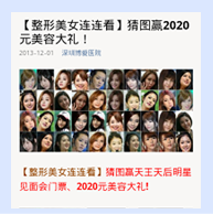 Pc端營銷應該與手機營銷策略有所區(qū)別,營銷的方式有千萬種,以價格優(yōu)惠是我們目前常做的。而最近我看到的一個游戲策略來推出活動的方式,更加有趣。整形美女連連看,以獎品的形式推出優(yōu)惠內容,這種營銷策略我們也可以多學習參照。醫(yī)療微信完全也可以在微信上做,調動粉絲的參與積極性。也可以仿造做關卡游戲+孕育知識解答。