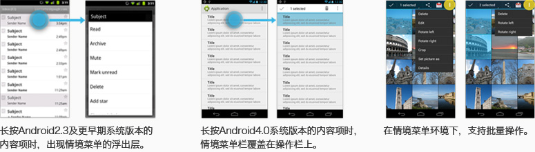 Android4.0中的長按與Android2.3及更早期的版本有很大的不同。早期版本長按操作后,是 出現(xiàn)情境菜單的浮出層。在Android4.0中,長按后在操作欄的位置會覆蓋一個臨時的情境操 作欄,不再彈出情境菜單浮出層。在臨時情境操作欄的環(huán)境下,當(dāng)前界面的內(nèi)容項允許被單個 處理,也允許被批量處理。