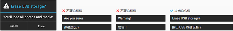 B:有標題欄的警告對話框:僅在有可能引起數(shù)據(jù)丟失、連接斷開、收費等高風(fēng)險的操作 時才使用。并且標題應(yīng)當(dāng)是一個明確的問題,內(nèi)容區(qū)提供一些解釋。