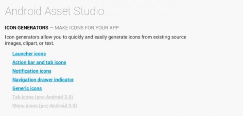 制作更加精美的圖標(biāo),可以前往Android Asset Studio進(jìn)行設(shè)計。該網(wǎng)站提供應(yīng)用所需要的所有圖標(biāo)的生成工具,包括菜單圖標(biāo)、動作欄圖標(biāo)、標(biāo)簽欄圖標(biāo)、通知圖標(biāo)等,而且操作簡單易行。