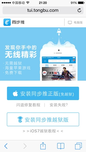 5.目前 iOS8 還不能越獄,但同步推無需越獄也可以免費下載正版軟件。只需用safari 訪問tongbu.com下載同步推正版,無需Apple ID也能免費享受海量軟件資源。