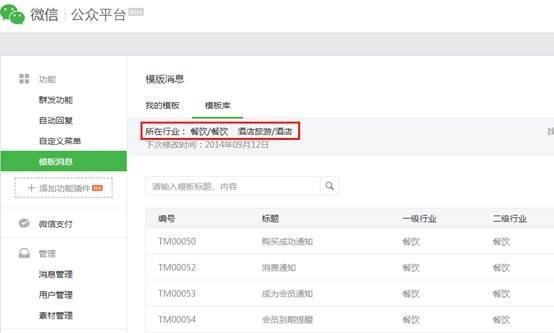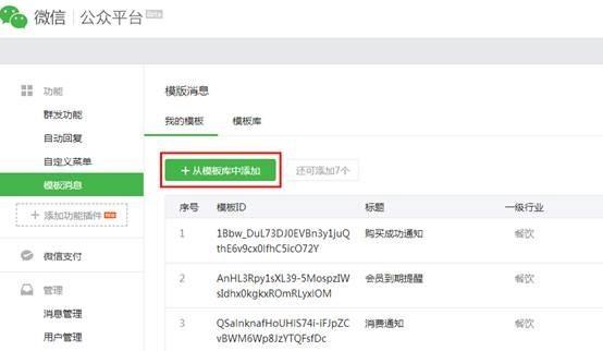 已開(kāi)通模板消息的服務(wù)號(hào)在公眾平臺(tái)“功能”菜單欄里可直接看到“模板消息”選項(xiàng),點(diǎn)擊后即可進(jìn)入模板消息界面。公眾號(hào)運(yùn)營(yíng)者首先需要選擇帳號(hào)服務(wù)所處的兩個(gè)行業(yè),進(jìn)而點(diǎn)擊“+從模板庫(kù)中添加”按鈕即可從模板庫(kù)中選擇這兩個(gè)行業(yè)的模板進(jìn)行服務(wù)通知。
