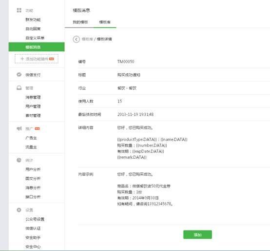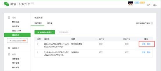 添加模板消息后,進(jìn)入“我的模板”即可查看模板消息詳情和刪除管理。