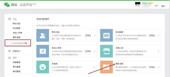 為保護(hù)用戶的使用體驗(yàn),目前,具有支付能力的公眾號(hào)才可以使用模板消息進(jìn)行服務(wù)。符合使用條件后的服務(wù)號(hào)登陸微信公眾平臺(tái)后都可在“功能”—“添加功能插件”選項(xiàng)里看到申請(qǐng)“模板消息”的功能入口。點(diǎn)擊“模板消息”進(jìn)行申請(qǐng)并獲得使用權(quán)限后,即可開(kāi)始使用。
