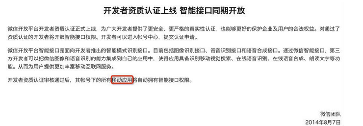 微信開(kāi)放平臺(tái)(不是微信公眾平臺(tái))昨天宣布上線開(kāi)發(fā)者認(rèn)證功能,與此同時(shí)開(kāi)放的還有智能接口,具體內(nèi)容如下: