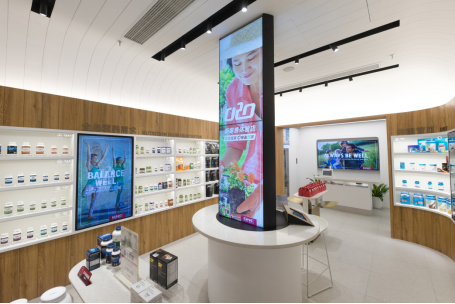 店內(nèi)中央顯示區(qū)和陳列顯示區(qū),可直觀展示品牌“美式健康生活”視覺風(fēng)格及店內(nèi)活動介紹。消費者也可以通過店內(nèi)的交互觸屏,探索更多GNC信息以及根植于品牌深處的科學(xué)基因。此外,店內(nèi)還開辟了咨詢互動空間,方便健康顧問與消費者進(jìn)行深入溝通。